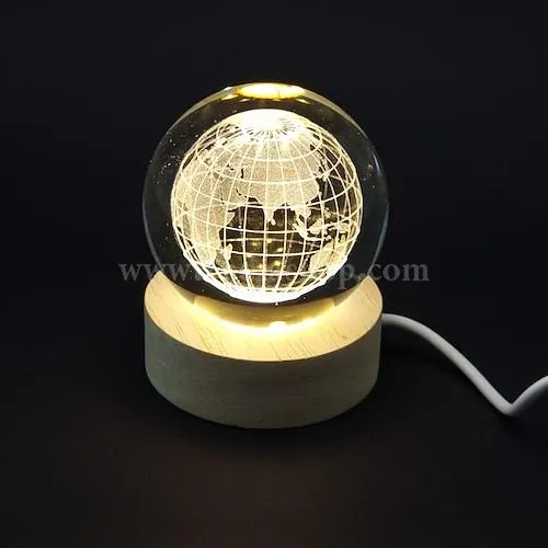 پایه ی چوبی زیر گوی از طریق کابل USB به برق متصل می گردد، در داخل پایه چوبی این گوی، ال ای دی های روشنایی وجود دارند، این چراغ خواب کریستالی به صورت سه بعدی می باشد.