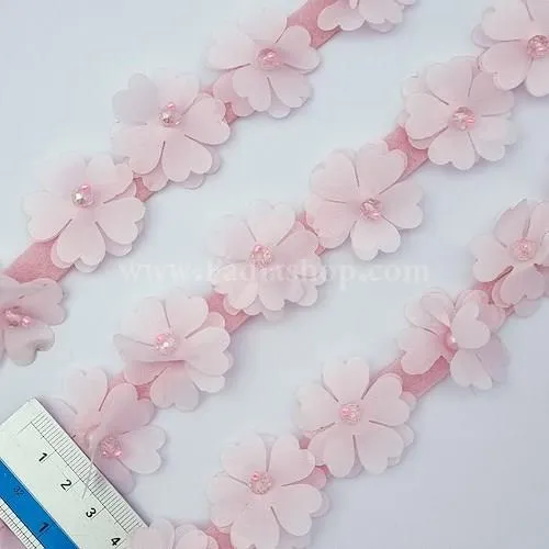 گلهای مرواریدی به عرض 3 سانت و به واسطه نوار باریک پارچه به یکدیگر متصل شده اند و در رنگ های مختلف ارائه می شود. هر متر حدود 30عدد گل دارد.
