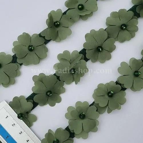 گلهای مرواریدی به عرض 3 سانت و به واسطه نوار باریک پارچه به یکدیگر متصل شده اند و در رنگ های مختلف ارائه می شود. هر متر حدود 30عدد گل دارد.