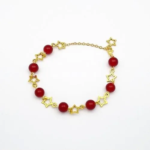 دستبند مهره دار قرمز با طول 20 سانت، و بند زنجیری فلزی محکم، ترکیبی جذاب از مهره های قرمز درخشان و ستاره های فلزی طلایی رنگ است. علاوه بر زیبایی، دوام بالایی دارد و انتخابی شیک برای استفاده روزانه یا مجالس است. جلوه ای خاص و لوکس به استایل شما می بخشد.