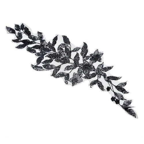 تکه دوزی دوختنی، جنس تور ظریف، به ابعادطول 43، عرض 13سانت، روی تور مشکی با منجوق و پولک،کار شده است تا جلوه ای درخشان و لوکس به لباس بدهد. مناسب برای سرشانه، آستین، شومیز، مانتو، کت، می باشد.