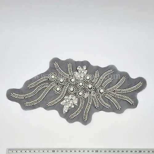 تکه دوزی دوختنی، جنس تور ظریف، به ابعادطول 31، عرض 14سانت، روی تور مشکی با منجوق و مروارید سفید و مشکی کار شده است تا جلوه ای درخشان و لوکس به لباس بدهد. مناسب برای سرشانه، آستین، شومیز، مانتو، کت، می باشد.