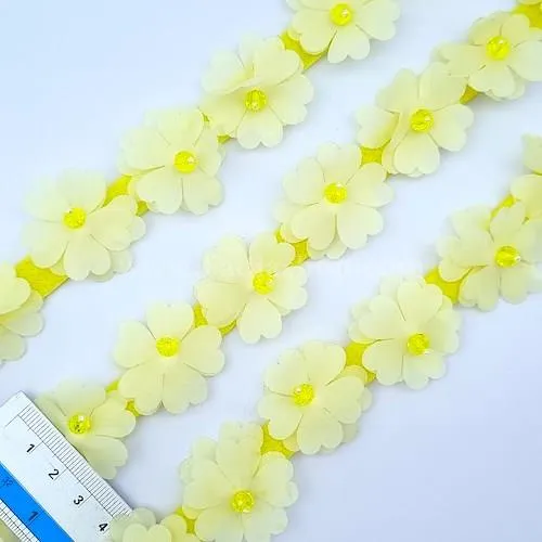 گلهای مرواریدی به عرض 3 سانت و به واسطه نوار باریک پارچه به یکدیگر متصل شده اند و در رنگ های مختلف ارائه می شود. هر متر حدود 30عدد گل دارد.