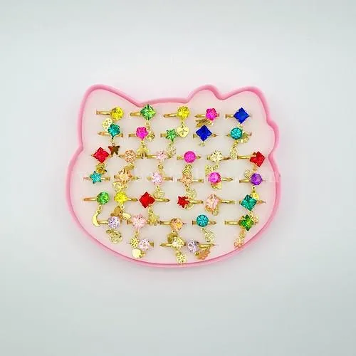 انگشتر بچه گانه نگین رنگی با رکاب فلزی طلایی، دارای آویز زیبا و طراحی قابل انعطاف برای تنظیم سایز است. هر بسته شامل 36 عدد انگشتر یا طرح و رنگ متنوع است. این انگشترها به دلیل ترکیب فلز طلایی با نگین های رنگی، جلوه فانتزی و خاصی دارند.