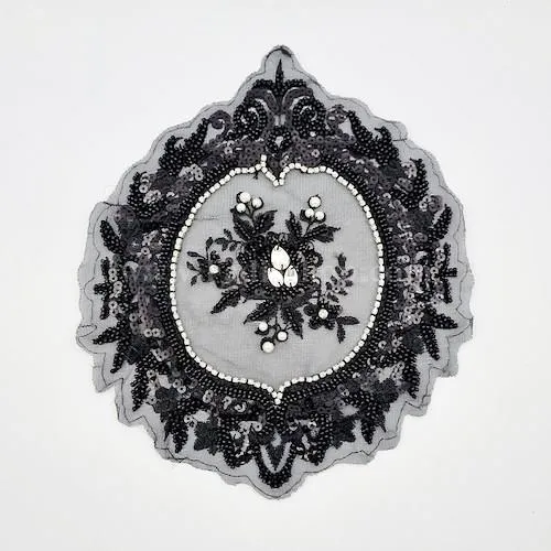 تکه دوزی دوختنی، جنس تور ظریف، به ابعادطول23، عرض 21سانت، روی تور مشکی با منجوق و مروارید،کار شده است تا جلوه ای درخشان و لوکس به لباس بدهد. مناسب برای سرشانه، آستین، شومیز، مانتو، کت، می باشد.