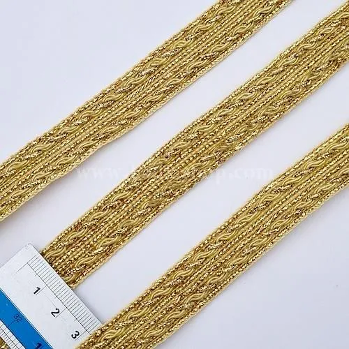 نوار تزئینی زری دار، طرح بافت، عرض 1?8 سانت، طول 9 متر، جلوه ی طلایی، این نوار بافت دار قابل استفاده برای لبه دوزی یقه، آستین، حاشیه دامن و تزئینات لباس مجلسی است.