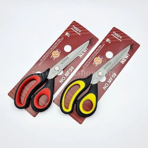 قیچی خیاطی برند تایگر، با تیغه روکش تیتانیوم، طول 23 سانت، تیغه حدود 10 سانت، عرض 8?5 سانت، و دسته ای مجهز به ماساژور، انتخابی حرفه ای برای برش دقیق پارچه های ضخیم و چندلایه، دوام بالا، لغزش کم و راحتی بیش تر در استفاده داخلی کارگاه یا خیاطی خانگی.