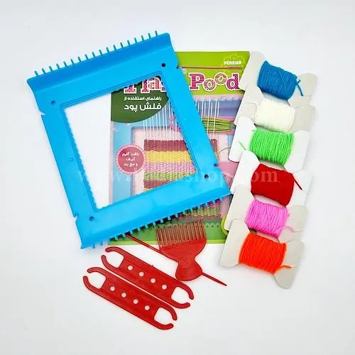 دار گلیم بافی فلش پود، یک مجموعه آموزشی و سرگرم کننده با جنس لاکی است، ابعاد قاب دارگلیم طول 20، عرض 17 سانت، سوزن PVC بی خطر و کامواهای رنگی، به کودکان امکان یادگیری گلیم بافی، ساخت کیف، مچ بند و زیرلیوانی را می دهد و خلاقیتشان را پرورش می دهد.