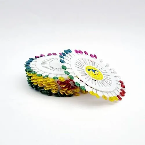 سوزن ته مروارید، 12 برگ، هر برگ حدود 30 عدد، طول هر سوزن تقریباً 5 سانت، سر آن مروارید طرح گل نصب شده که از عبور کامل سوزن و گم شدن جلوگیری می کند. مناسب برای نشانه گذاری رو پارچه، فیکس کردن الگو روی پارچه.