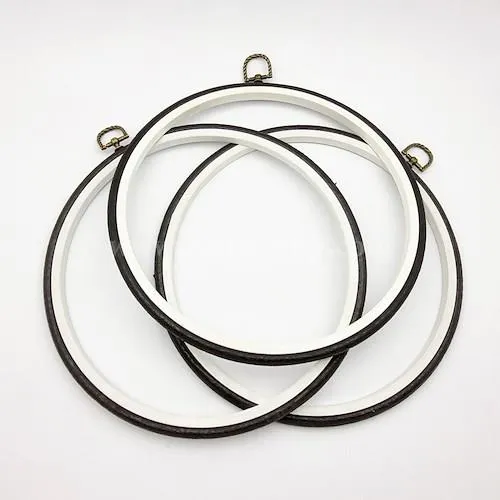 کارگاه گلدوزی ژله ای رنگ مشکی با قطر بیرونی 26.5 سانت، قاب سبک، مقاوم و مدرن برای گلدوزی، شماره دوزی، دوخت دستی است. ساختار ژله ای، یعنی بدنه ای پلاستیکی فشرده با حلقه خارجی سیلیکونی یا انعطاف پذیر، پارچه را محکم و بدون چین خوردگی نگه می دارد.