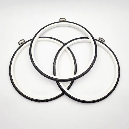 کارگاه گلدوزی ژله ای رنگ مشکی با قطر بیرونی 21.5 سانت، قاب سبک، مقاوم و مدرن برای گلدوزی، شماره دوزی، دوخت دستی است. ساختار ژله ای، یعنی بدنه ای پلاستیکی فشرده با حلقه خارجی سیلیکونی یا انعطاف پذیر، پارچه را محکم و بدون چین خوردگی نگه می دارد.