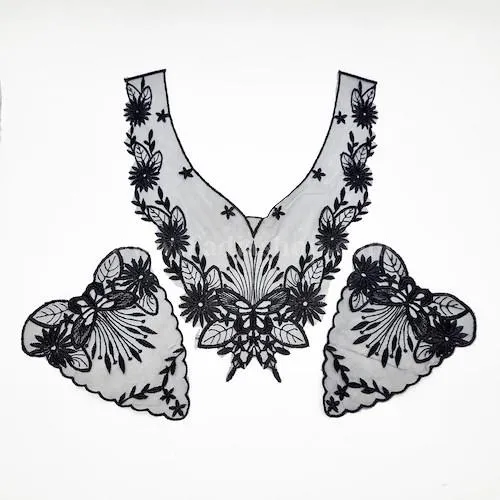 یقه و سرآستین آماده از جنس تور با طرح گلدار، ابعاد طول 32سانت، عرض 22 سانت، سرآستین طول 16.5سانت، عرض 12.5 سانت، یک قطعه تزئینی شیک و حرفه ای، برای زیبا کردن لباس هایی مثل مانتو، بلوز، پیراهن، بدون دردسر دوخت، جلوه ای ظریف و حرفه ای به استایل شما می دهد.