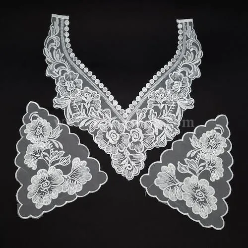 یقه و سرآستین آماده از جنس تور با طرح گلدار، ابعاد طول 30سانت، عرض 22 سانت، سرآستین طول 17.5سانت، عرض 12.5 سانت، یک قطعه تزئینی شیک و حرفه ای، برای زیبا کردن لباس هایی مثل مانتو، بلوز، پیراهن، بدون دردسر دوخت، جلوه ای ظریف و حرفه ای به استایل شما می دهد.