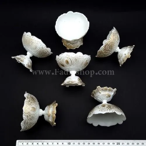ظروف 6 تایی مدل جام هفت سین شمس با جنس لاکی و رنگ سفید طلایی، قطر 7?5 سانت و ارتفاع 6?5 سانت، انتخابی شیک و ظریف برای چیدمان سفره هفت سین عید است که جلوه ای لوکس، هماهنگ و چشم نواز به دکور نوروزی شما می بخشد.