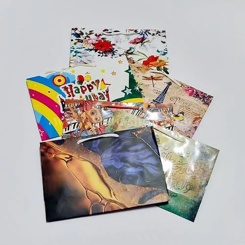 ساک دستی جنس گلاسه، مدل افقی، طول حدود 25، عرض حدود 17 سانت، تعداد هر بسته 6 عدد، طرح های مختلف، مناسب برای بسته بندی شیک و هدیه می باشد.