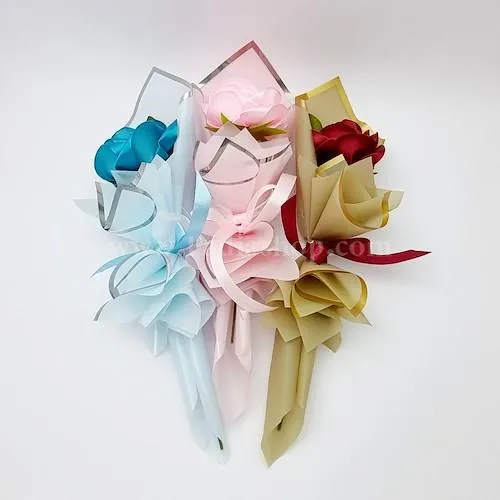 دسته گل رز، جنس گل ساتن براق، طول گل حدود 37 سانت، عرض حدود 11.5 سانت، دارای رنگبندی صورتی، قرمز، آبی.