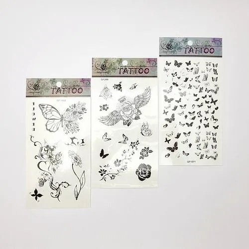 برچسب زنانه 6 برگ، با طرح های پروانه و گل، رنگ سیاه و سفید، بدون دردو ماندگاری موقت، برای مهمانی، یا استایل روزانه، انتخابی خلاقانه و جذاب برای زنان و دختران می باشد. طرح را روی پوست تمیزگذاشته،کمی آب بزنید، پس از چند ثانیه کاغذراجداکنید.
